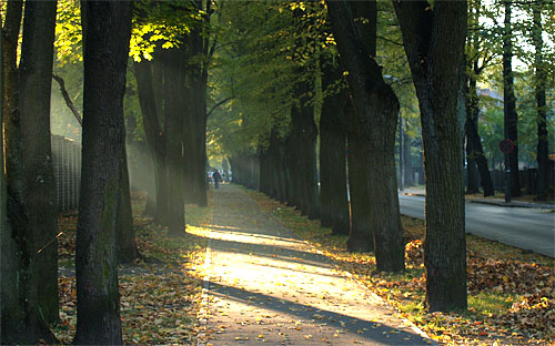Saules pieieta taka pie Stradiņa slimnīcas. Saule rotaļājas starp koku stumbriem. lai nu tā rotaļātos arī aiz sienas slimības gultās gulošo dzīvēs